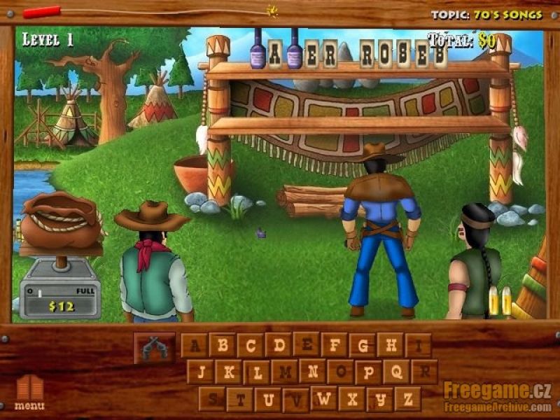 Your main character is faced with a long shelf on which your colleague arranges bottles of various sizes and colors. Fortunately, there are individual words separated. At the bottom are the letters. Once you click on some, the hero fires and reduces the number of bullets available, if he miss the letter and it's not in the title. It is advantageous to start with vowels and consonants, continue to words, which are common. Typical is THE etc. It happens that your name does not say anything, even if you have left just two letters. A freak is a very exciting, but for many more discouraging, because rarely are lucky, you guessed the name.