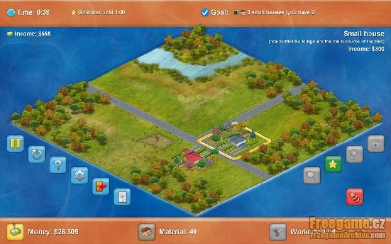 Townpolis Gold revolves constantly around the building. Getting the smallest and proceed further. You will be guided by a variety of licenses, purchase of materials and of course hiring workers. At the top of the screen, you have all of them. Initially, it is possible to build up already vacated areas, then you have to find your own place, namely the first cut down forests, to clear from the plain of dilapidated and unused buildings, etc. Each more advanced house , such as a supermarket or post office building requires a license. They are relatively expensive and the best you earn by initially building a lot of housings. Each of them can add a star. The more stars, more money. Smilies the yellow marks people are satisfied with that place, red discontent. Dissatisfaction can be reversed by adding to the buildings in the vicinity. However, this will soon become clear to you alone. A freak is extremely well designed, it puts a reasonable targets, so levels are proportionally long.