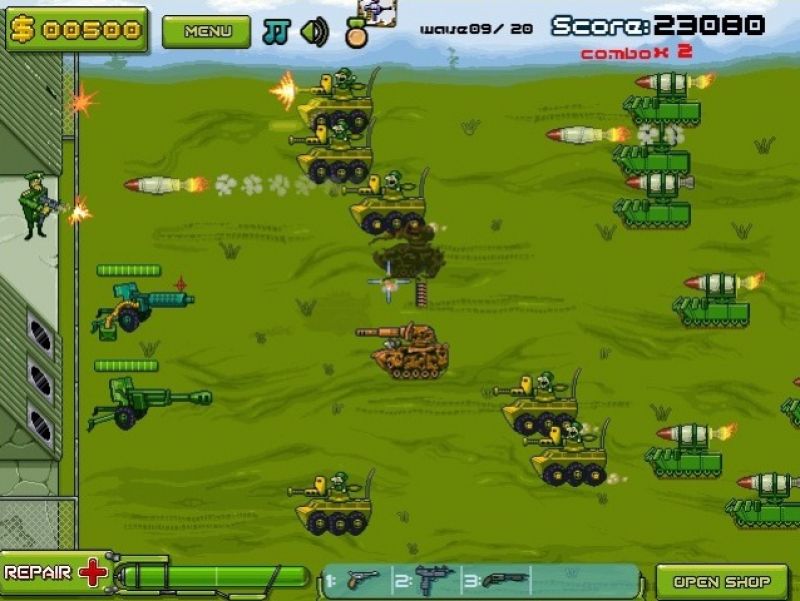 A bit crazy, maybe with too much clicking but great for abreaction game. You face a huge enemy superiority and you can only rely on his weapons. It gets a bit extreme because the hand gun can destroy hordes of tanks and rockets. But of course you can buy new better things plus come weak cannons helping you in the defence. The difficulty goes steep up after the first half.