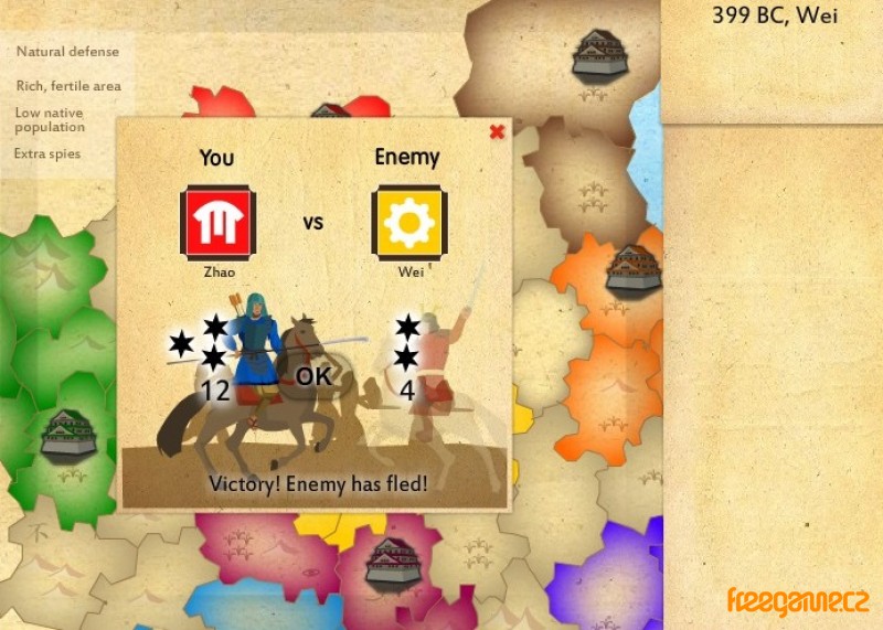 Choose your side you want to play for. Each has some certain plus or minus but the main power is in you. Hire soldiers and use it as effectively as possible. You only need to move the army to the area you want to conquer and the battle goes automatic. It’s a bit boring because you won’t know if you win or not until it’s over.
